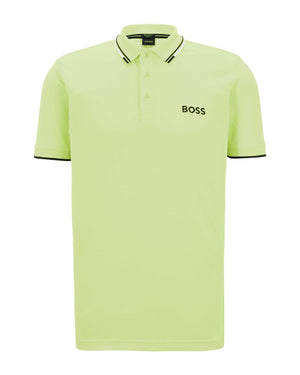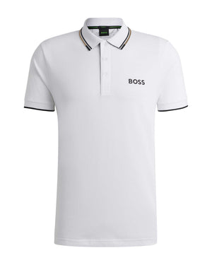 A distinctive polo shirt cut to a regular fit, by BOSS Menswear. Featuring contrast branding at the left chest and back neck, this short-sleeved polo shirt is designed in cotton-blend fabric with S.Café® and stretch for casual comfort. 3D stripes add a sporty touch at the collar and cuffs. S.Café® fabric is made from recycled coffee grounds, transformed by a patented process into a special yarn. This fabric provides exceptional wearing comfort coupled with permanent performance benefits including fast drying and odour control.